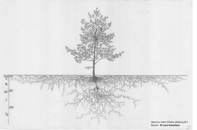 Le job des racines est de prospecter, de s’aventurer toujours plus loin dans ce milieu complexe qu’est le sol pour y puiser l’eau et les nutriments dont l’arbre a besoin. Et comme le sol est bien plus contraignant que l’atmosphère, il existe une très forte variabilité des systèmes racinaires.